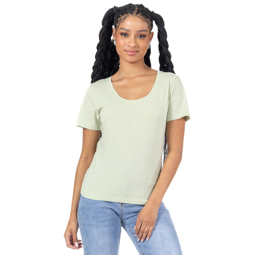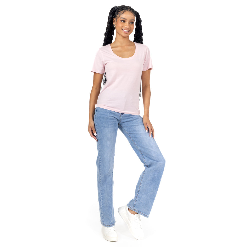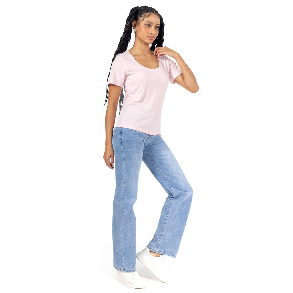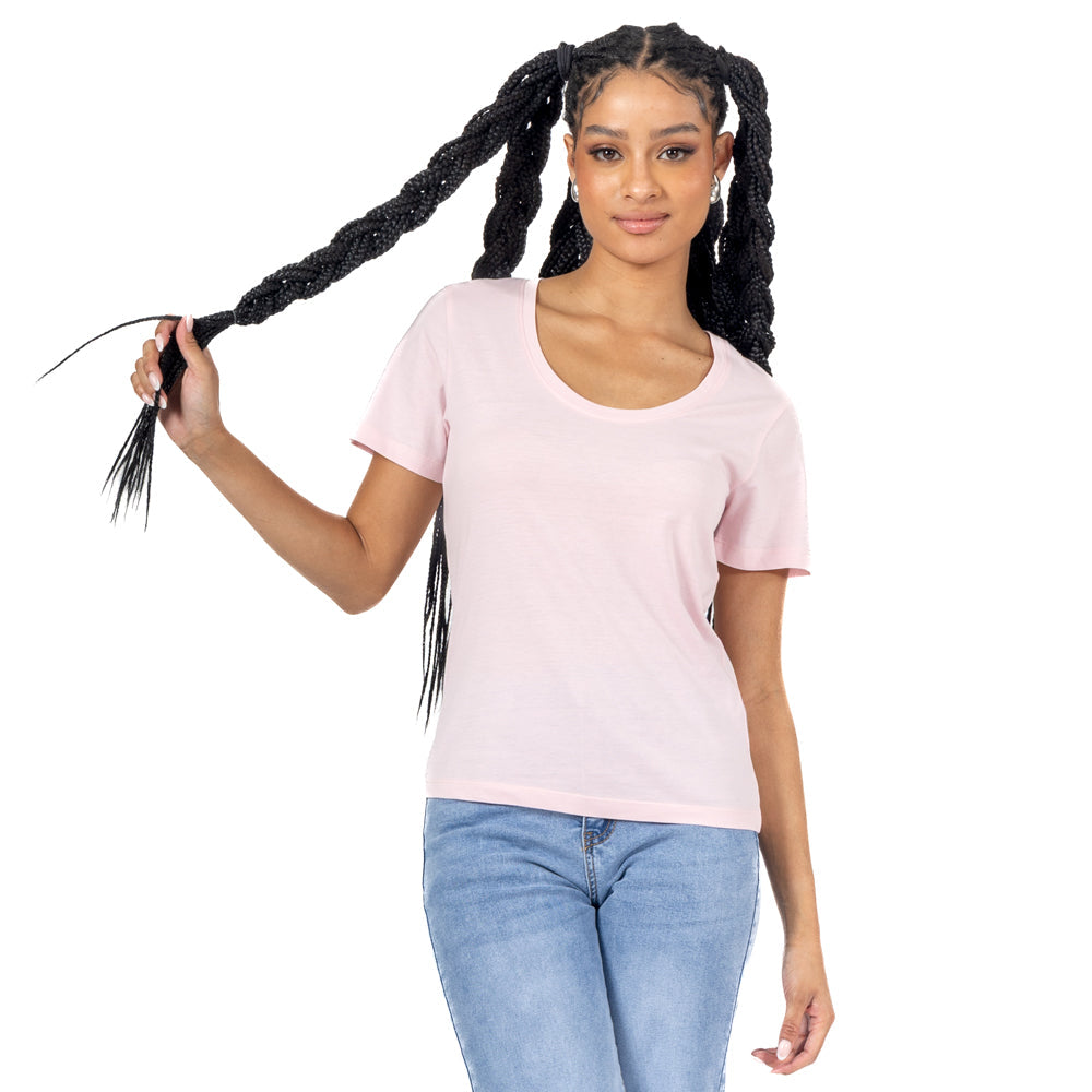 🔥 Tu go-to de diario: la Playera básica con cuello escotado en tono rosa suave le da un toque femenino y fresh a cualquier outfit, sin esfuerzo.