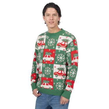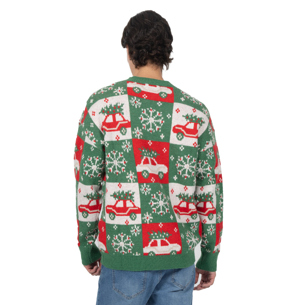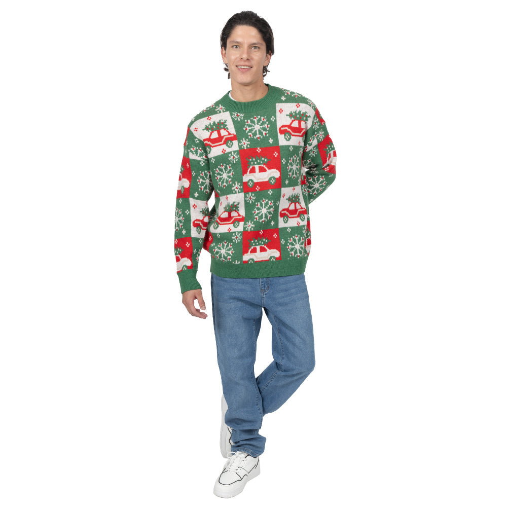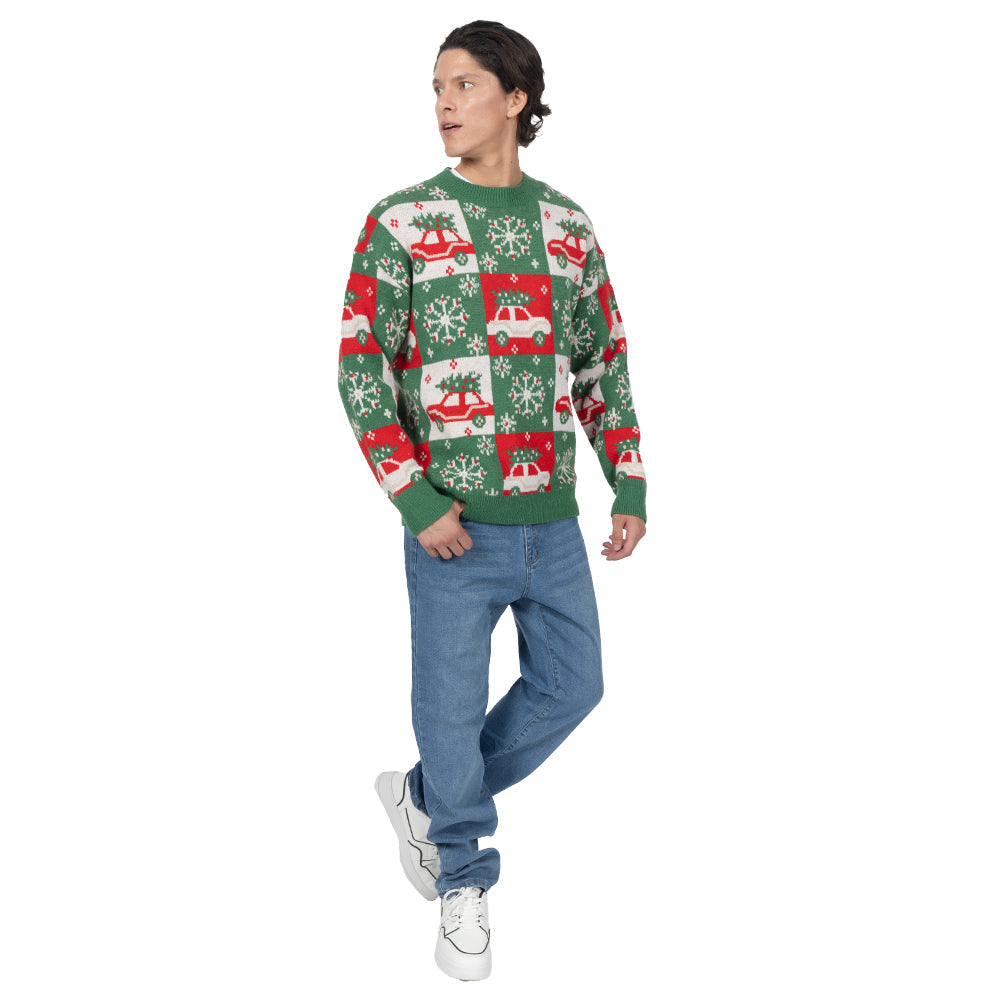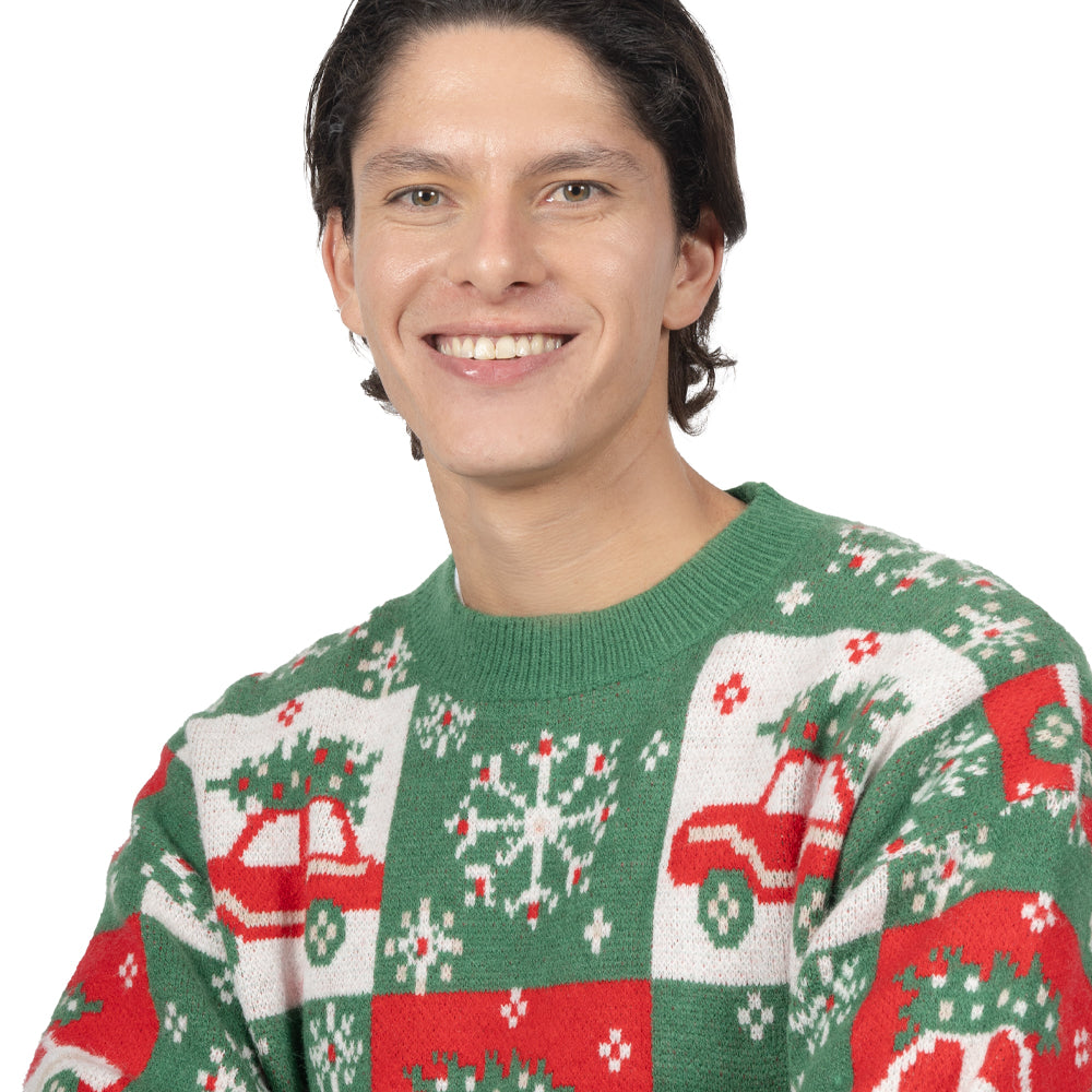 🔥 Navidad, pero con onda. Este suéter navideño con copos de nieve y print tipo “ugly sweater” (carros + arbolito) es el perfecto para robarte la foto en la posada.