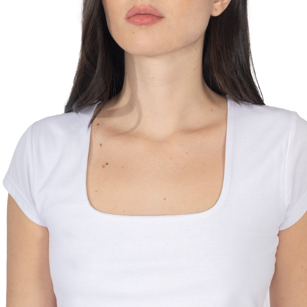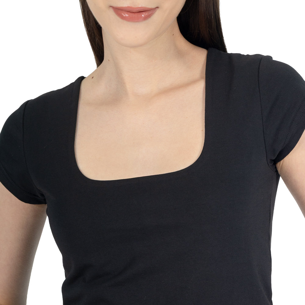 Playera slim para mujer con escote cuadrado y manga corta, hecha para looks limpios que se ven más definidos desde la parte superior.
