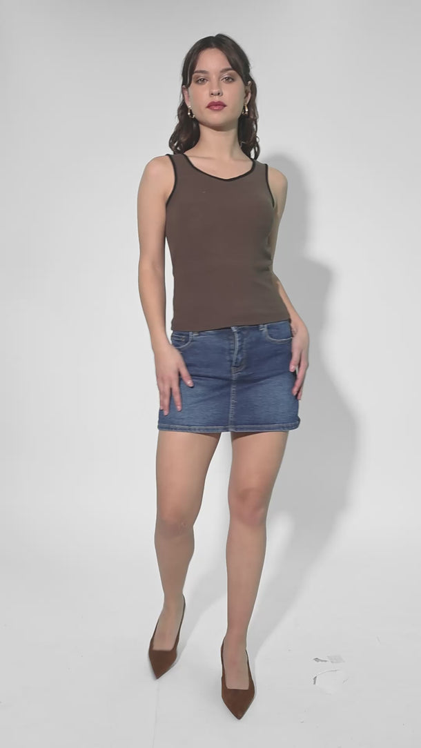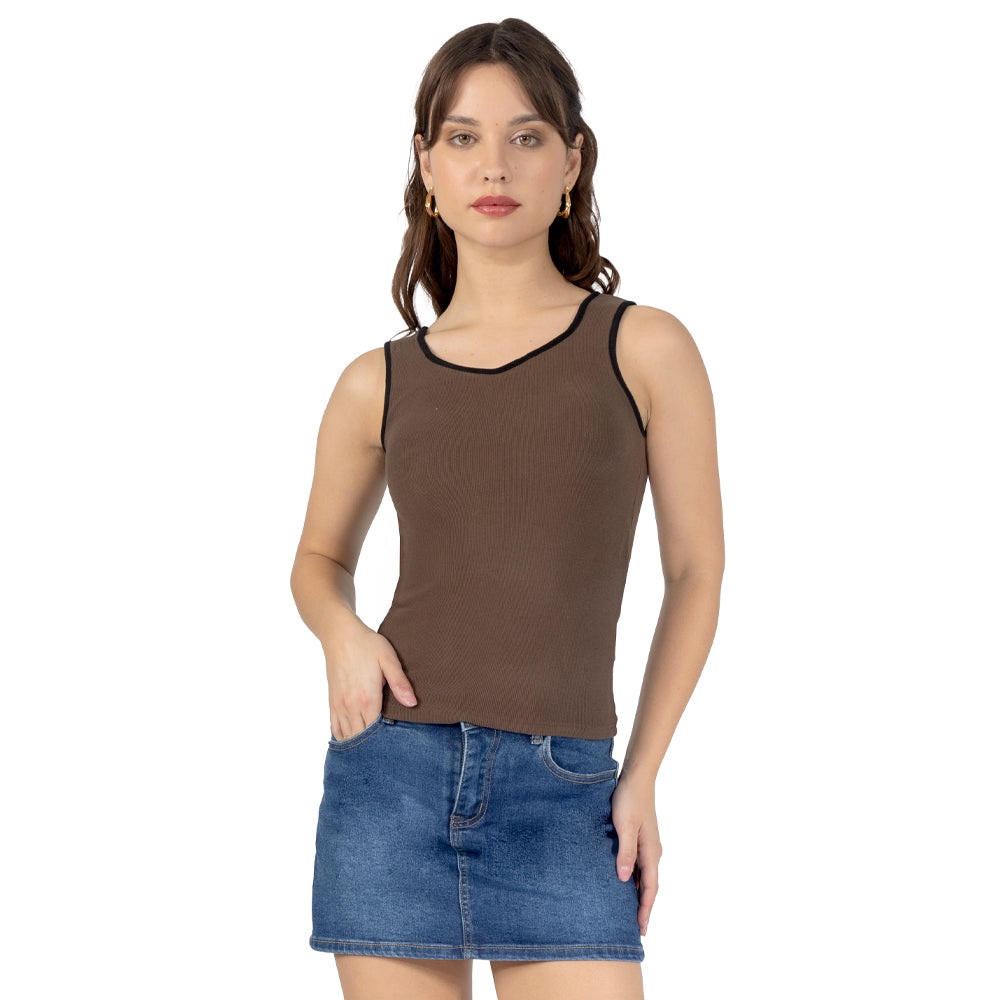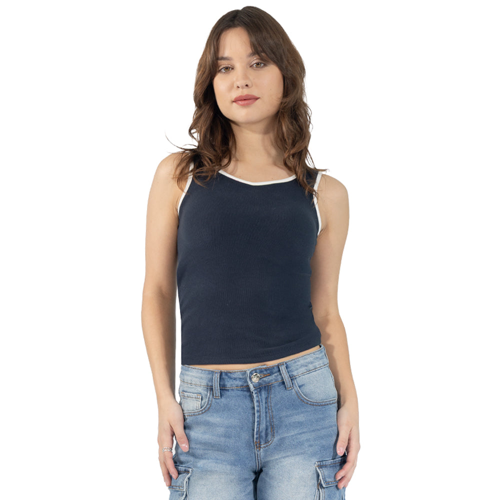 Playera crop slim para mujer sin manga y con contraste en rib, ideal para armar looks pegados al cuerpo con un detalle que sí se note.