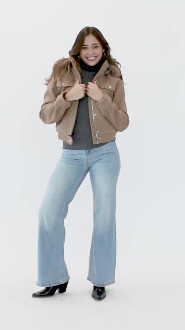 🔥 Utilitaria y chic. Cuello alto + bolsas con tapa en pecho para un look urbano, estructurado y súper combinable.