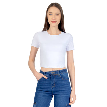 Playera lisa ajustada de cuello redondo con manga corta y fit slim, hecha para llevarse pegada al cuerpo y armar outfits más definidos.