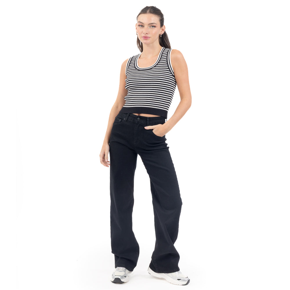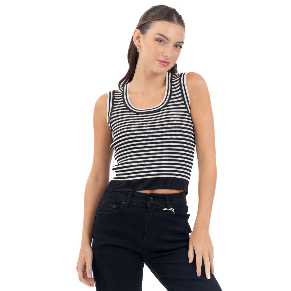 Playera sin manga a rayas con cuello redondo para armar looks ligeros y directos, con un diseño que destaca sin cargar el outfit.