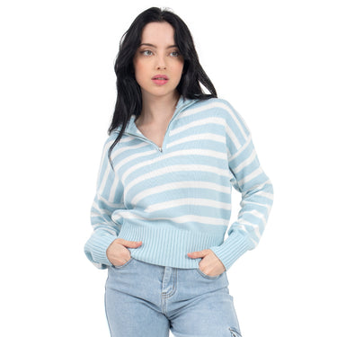 ¡Viste en tendencia, viste Quarry! Con nuestro suéter con cuello polo, cierre y diseño a rayas, es perfecto para sentirte cómoda y en tendencia