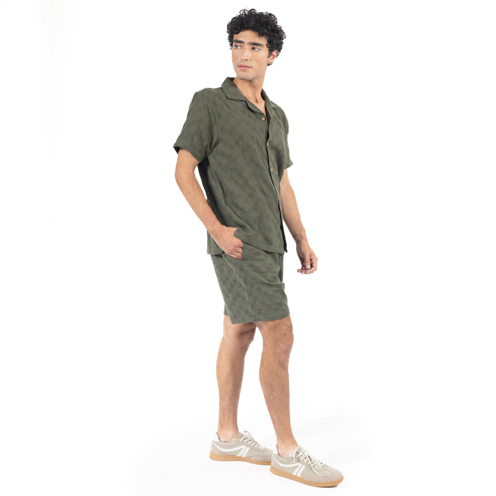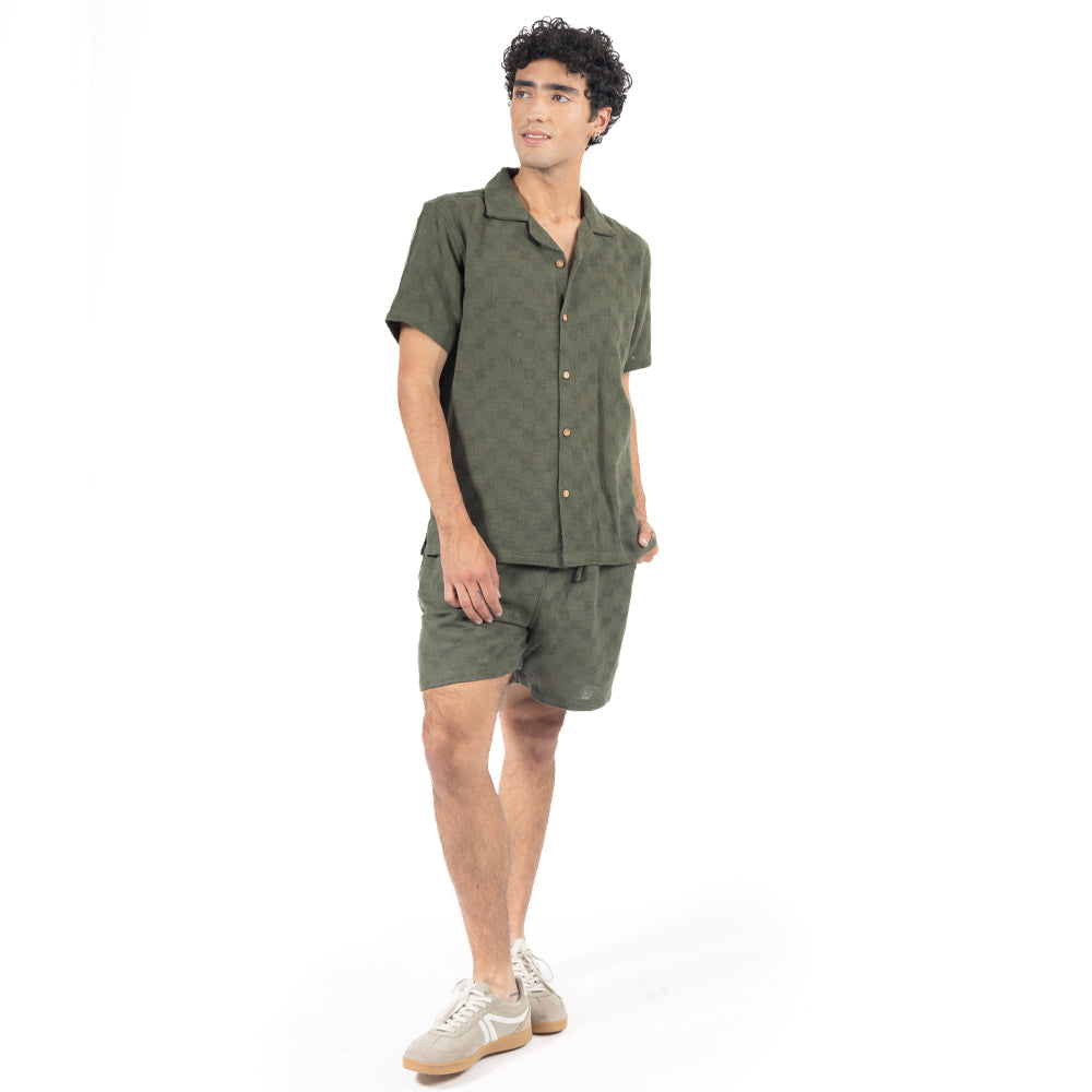 🔥 Relajada, con actitud y cero complicada. Esta camisa resort manga corta en tono verde olivo y tela texturizada se ve cool desde el primer botón.