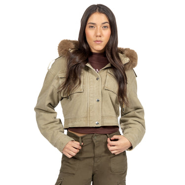 Chamarra corta con peluche en capucha, botones y bolsas con tapa.