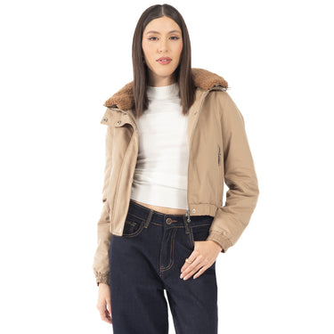 Chamarra corta con cierre y botones, elástico en cintura y capucha con peluche.