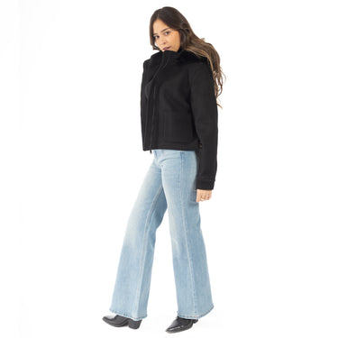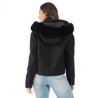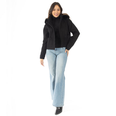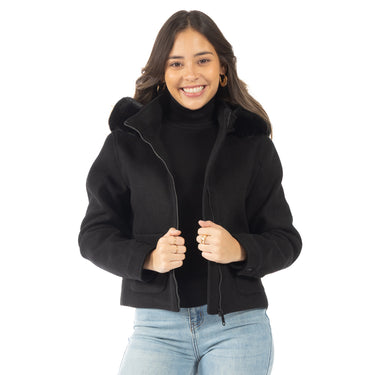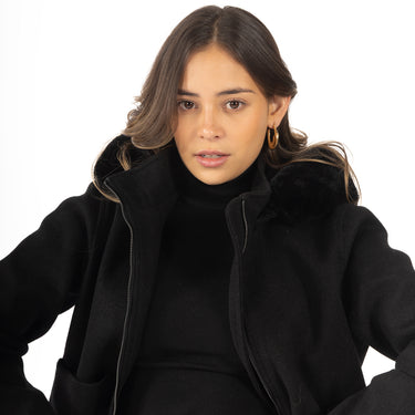Abrigo paño con cierre, capucha con peluche y bolsas.