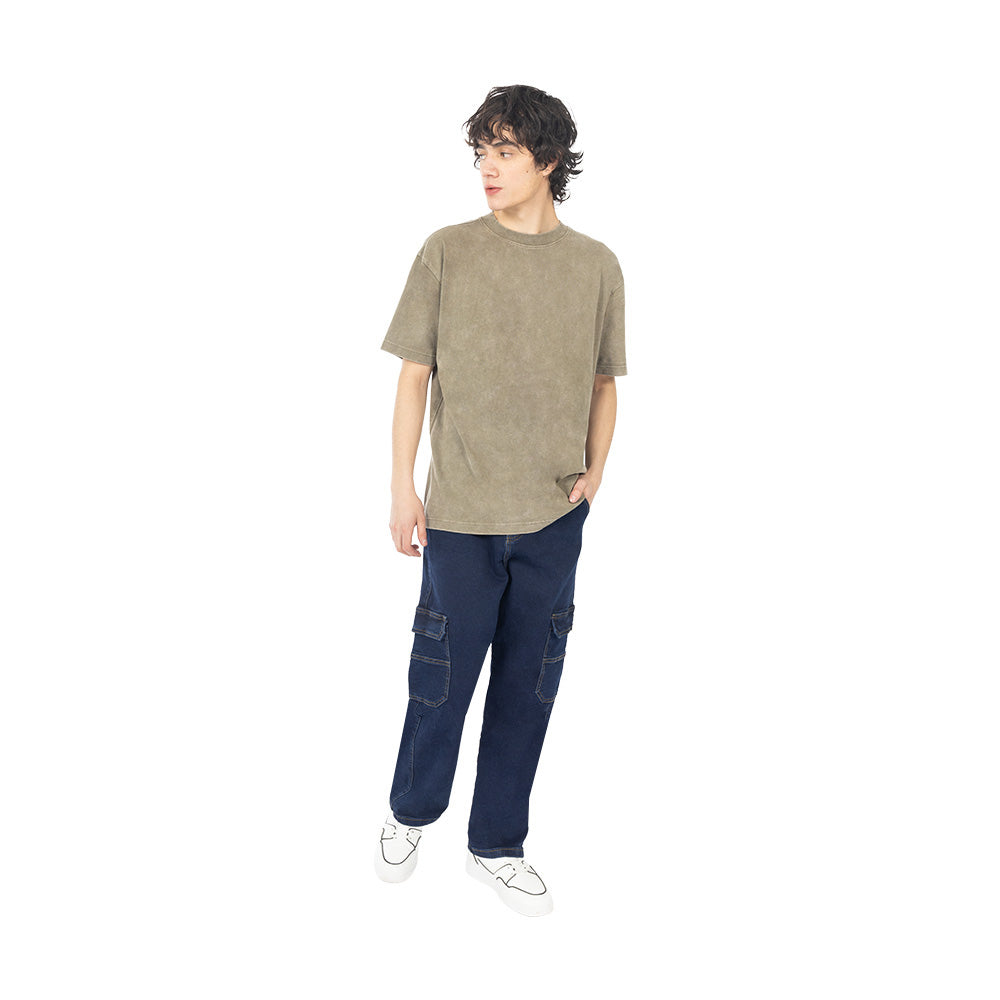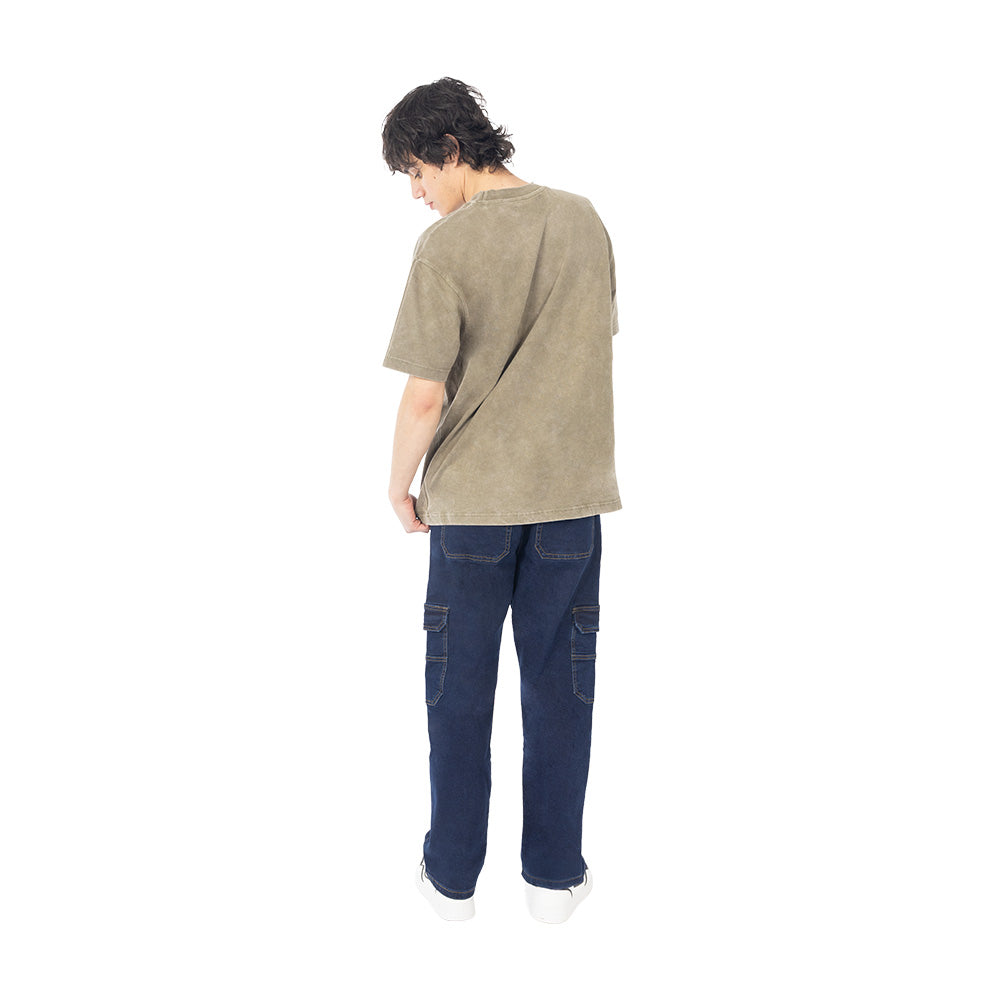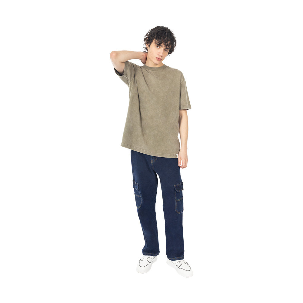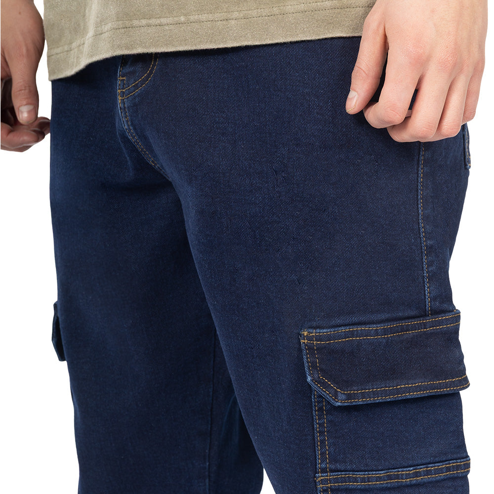 La mezclilla comfort con stretch hace que el volumen se sienta más cómodo al usarlo; el detalle cargo cambia el jean completo y le da un frente más fuerte.