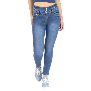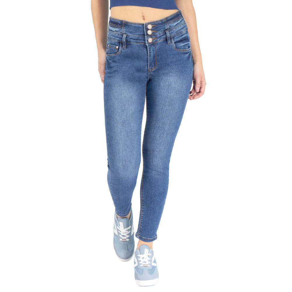 Jeans de tiro alto con triple botón y cinco bolsillos para una cintura más marcada y un frente más firme.