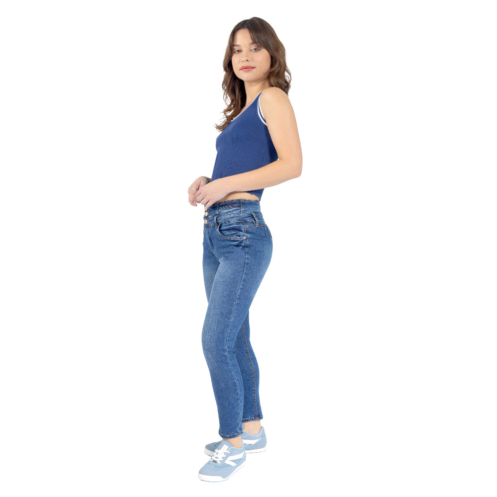 JEANS TIRO ALTO CON TRES BOTONES Y 5 BOLSILLOS