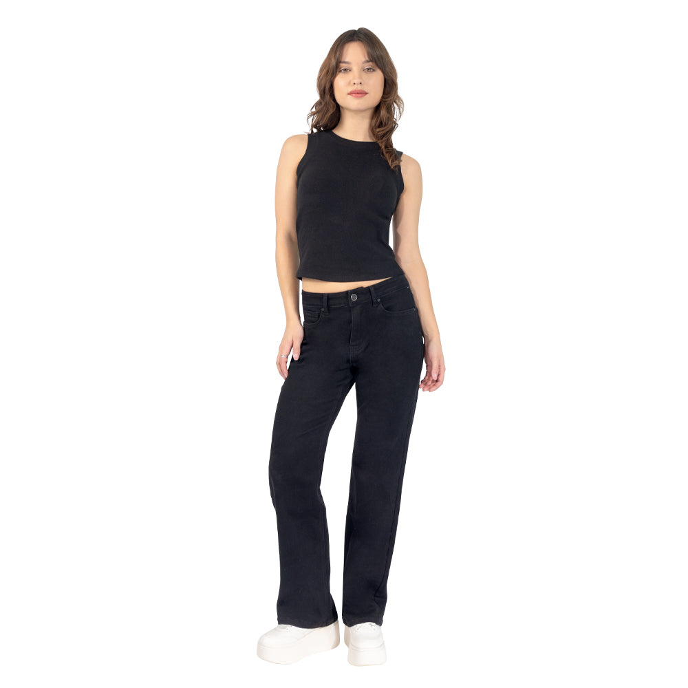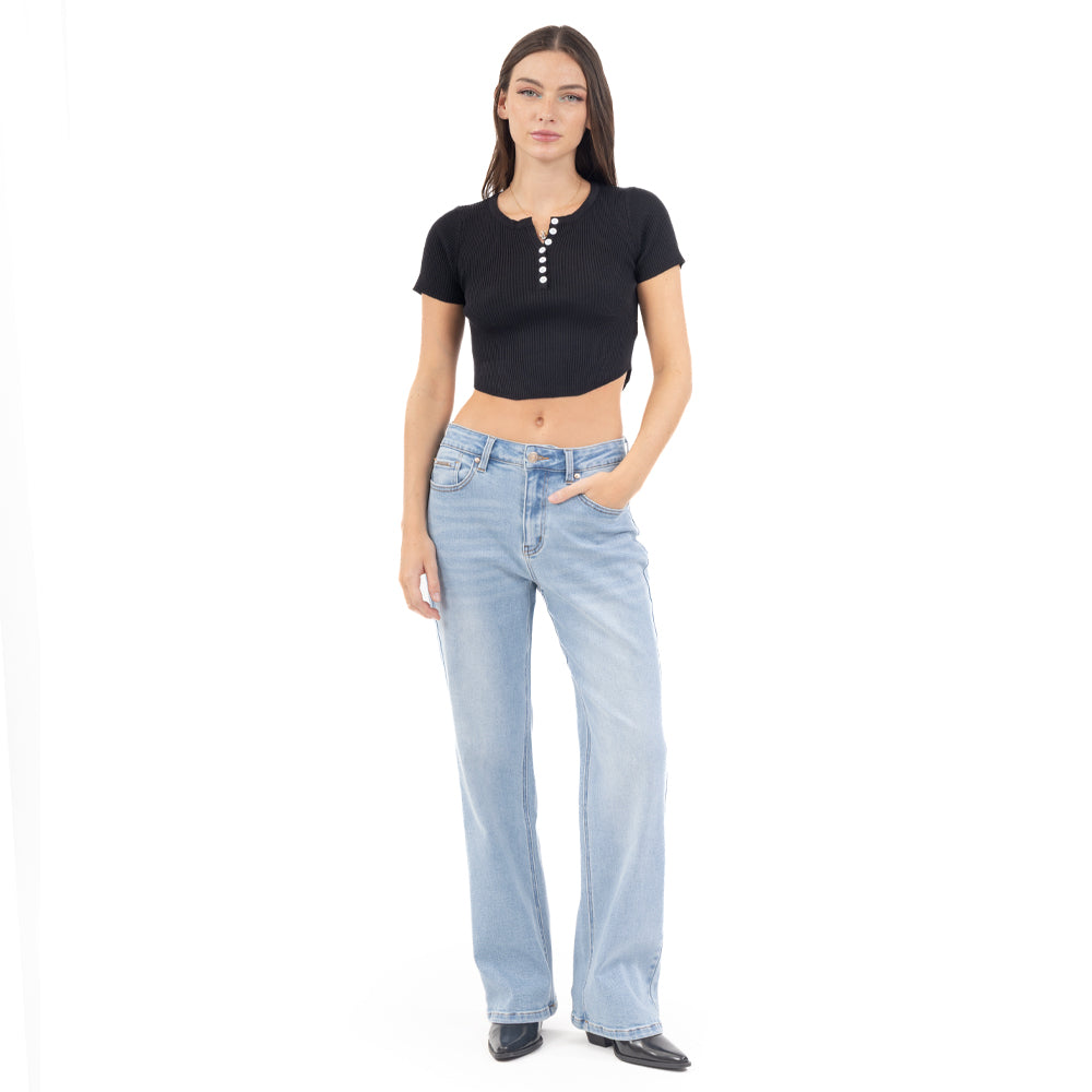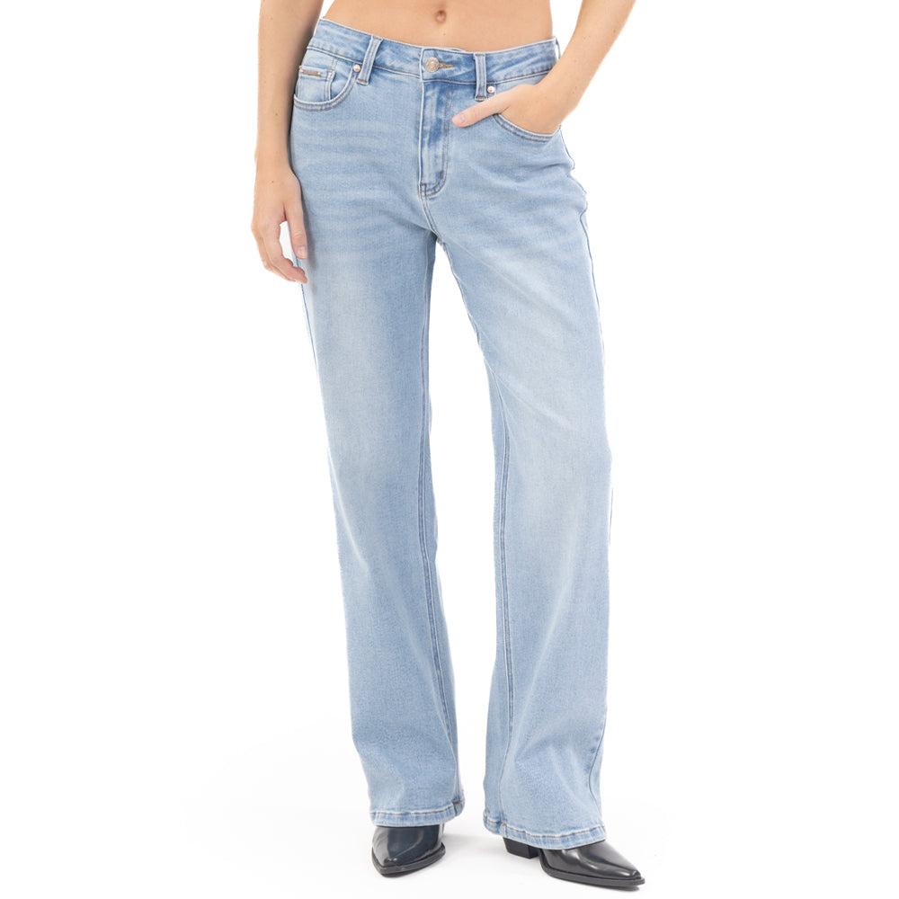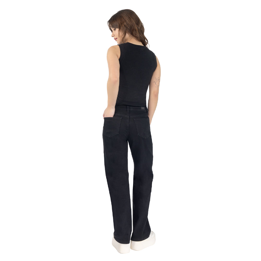 Jeans wide leg con cinco bolsillos y pierna amplia para una caída más abierta y marcada.