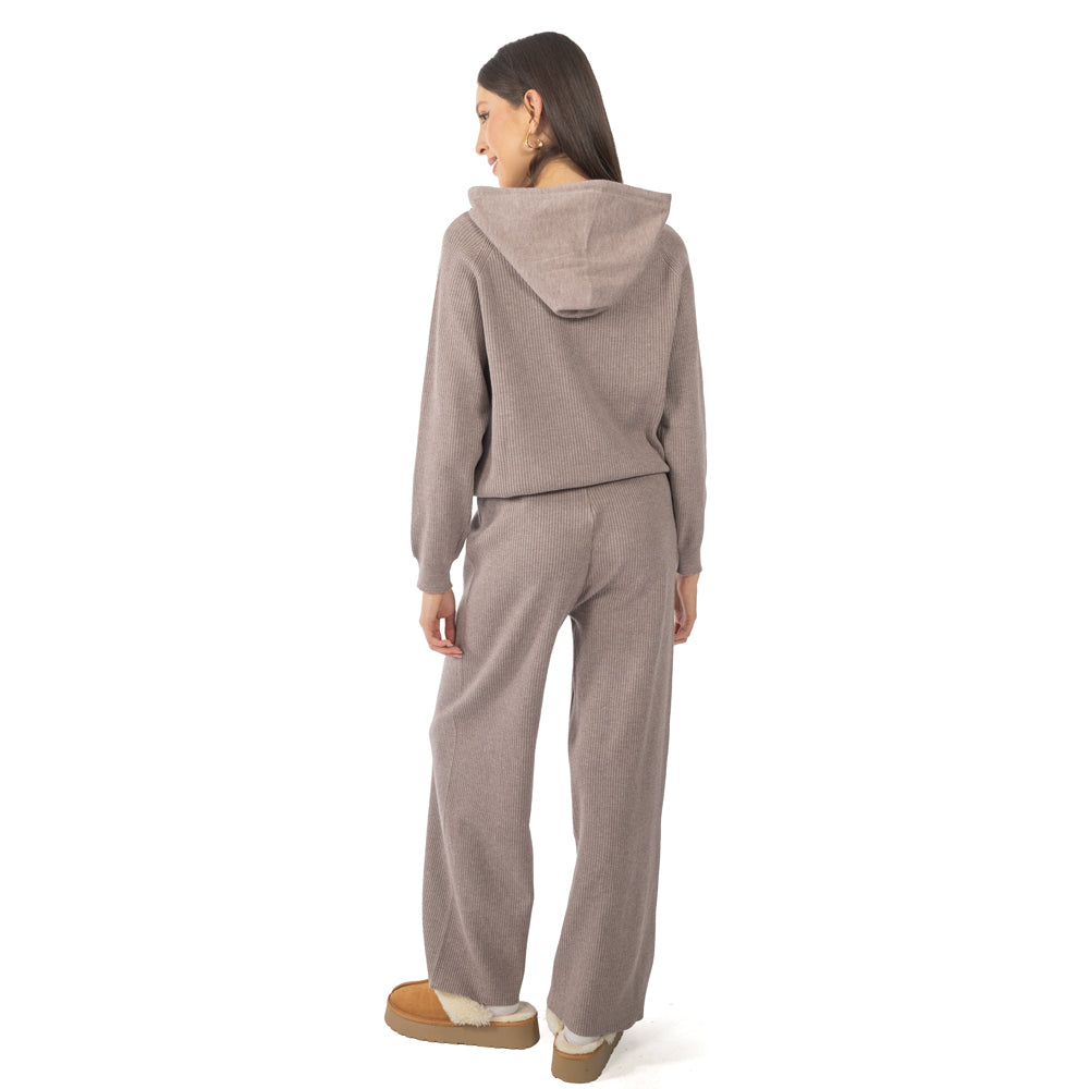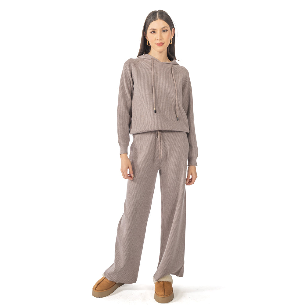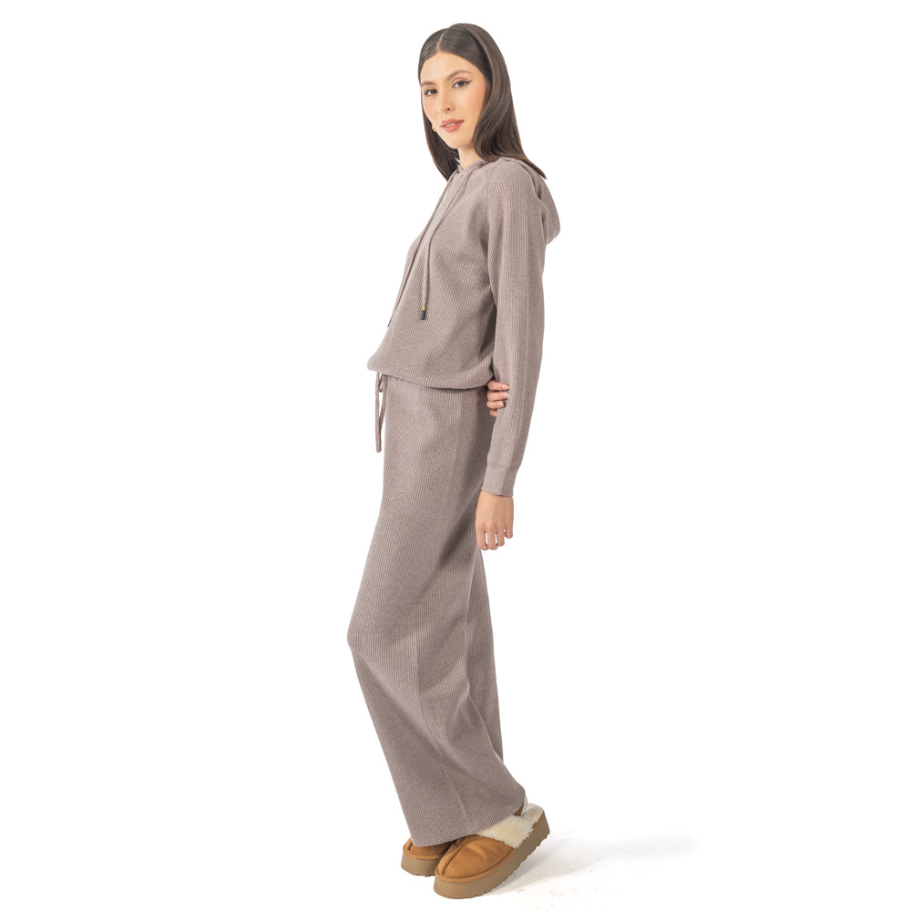 Pantalón tejido liso con jareta en cintura, pierna suelta desde la cadera hasta el dobladillo.